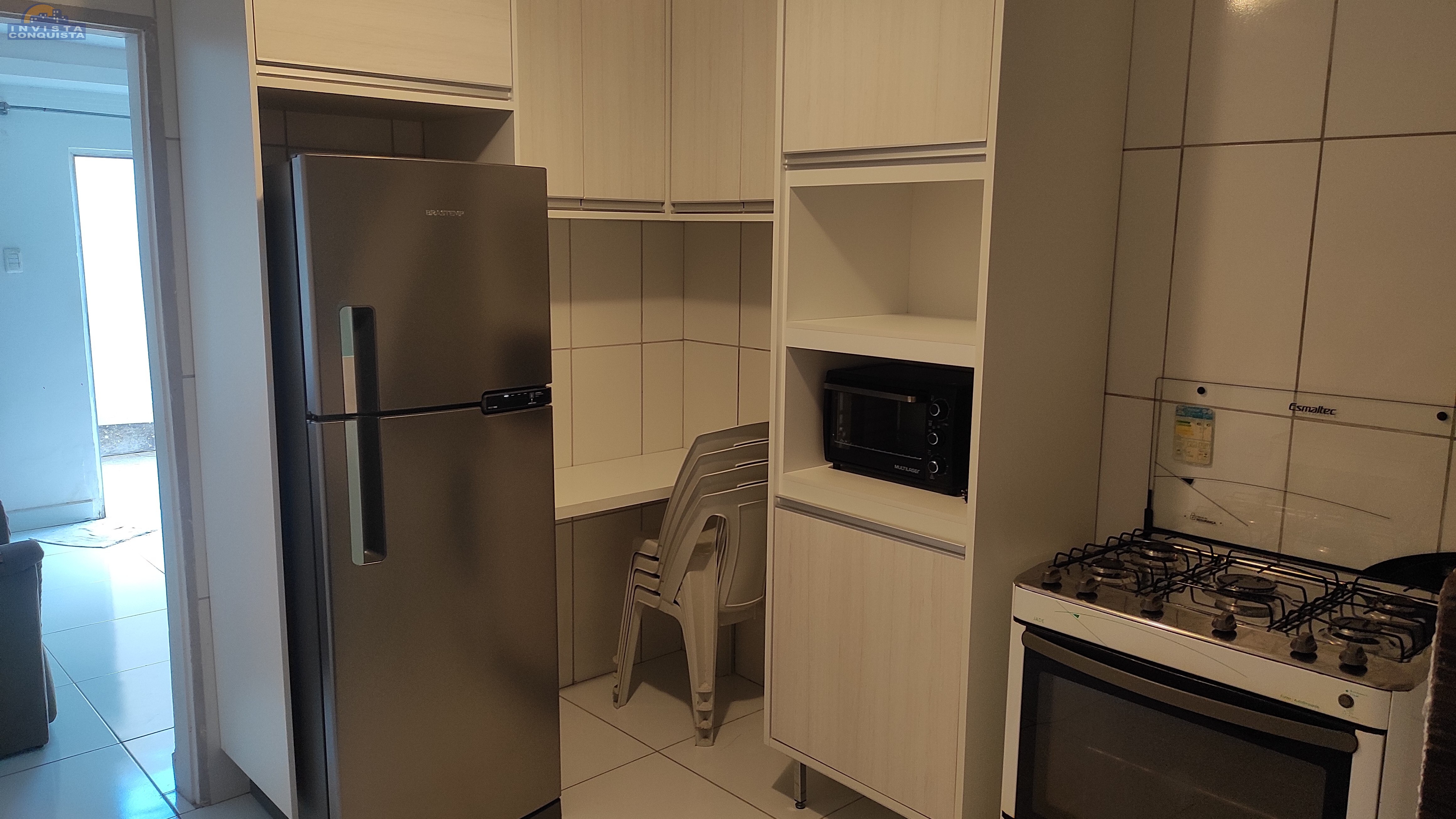 No térreo, o apartamento possui uma sala aconchegante, equipada com jogo de sofá e rack, perfeita para relaxar e receber visitas. A cozinha é planejada e equipada, facilitando seu dia a dia na hora de preparar suas refeições.